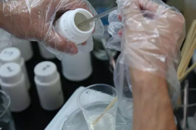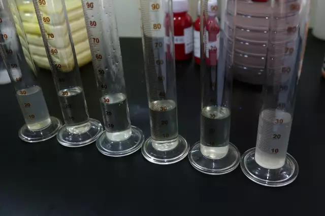 李工首先取樣冷卻液,然后往6個樣品杯中分別加入30g原液,分別滴加一款成熟配方的冷卻液消泡劑。機械攪拌均勻后,再靜置1小時,觀測相溶性效果。