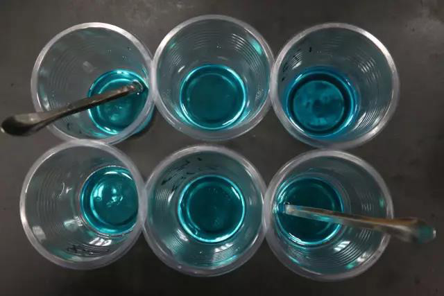 李工首先取樣,然后往6個樣品杯中分別加入20g清洗劑原液,分別滴加一款成熟配方的清洗劑消泡劑各0.06g,機械攪拌,靜置觀測透明度情況。