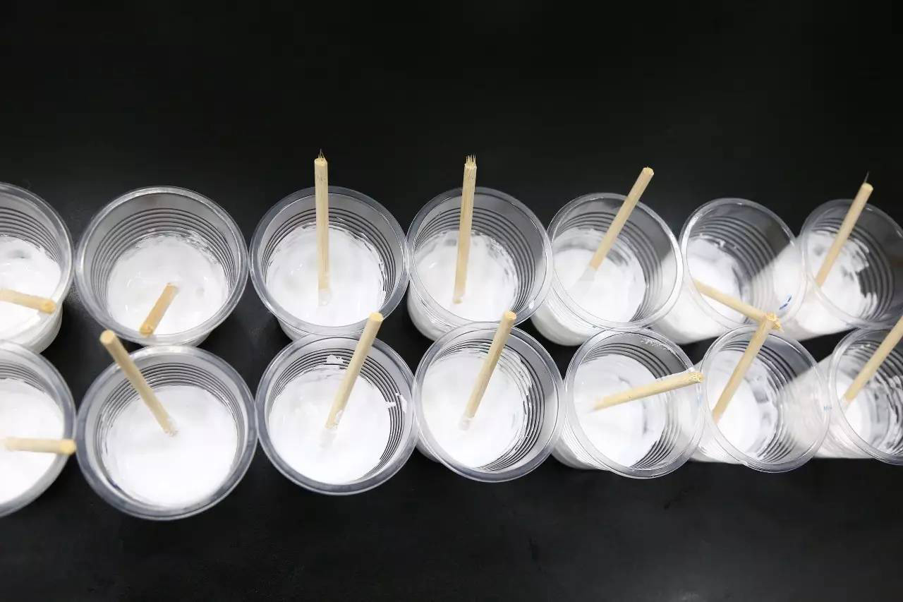 王工首先將硬脂酸鋅乳液取樣到燒杯中,然后將硬脂酸鋅乳液分別注入20個樣品杯中,每個樣品杯均10g。然后往20個樣品杯分別滴加一款適合助磨劑配方的中聯邦消泡劑,各0.05g。