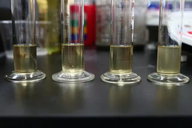 振蕩完成后,取出所有量筒,觀測各款產品的消泡效果。用秒表記錄各量筒消泡所需時間。然后將各量筒靜置2小時,觀測各量筒透明度情況,是否存在漂油析出問題。